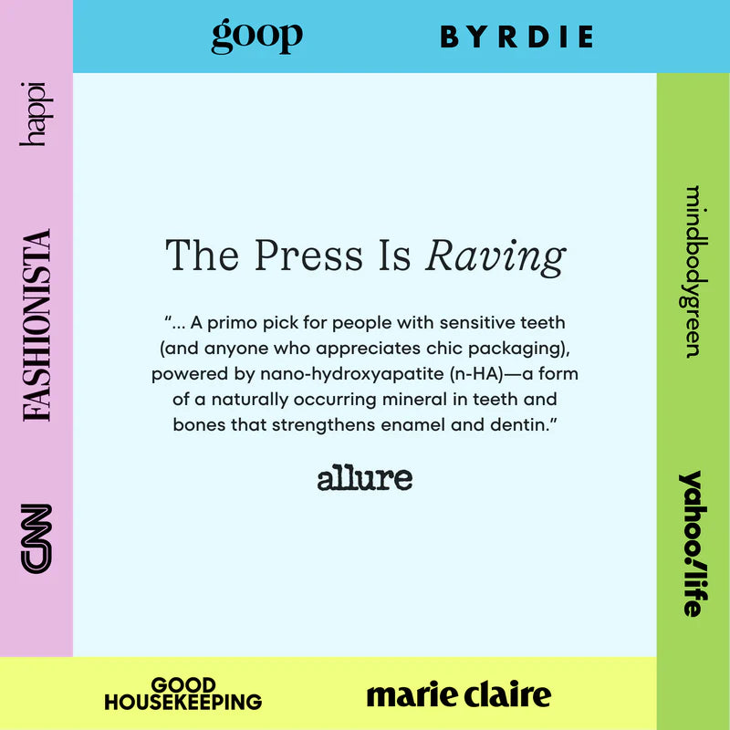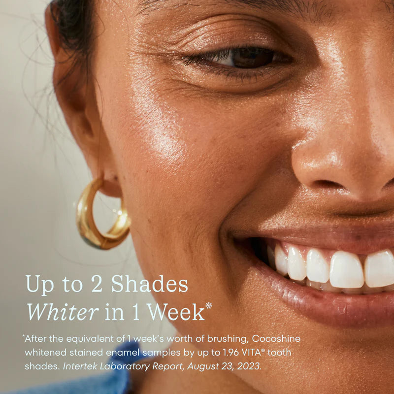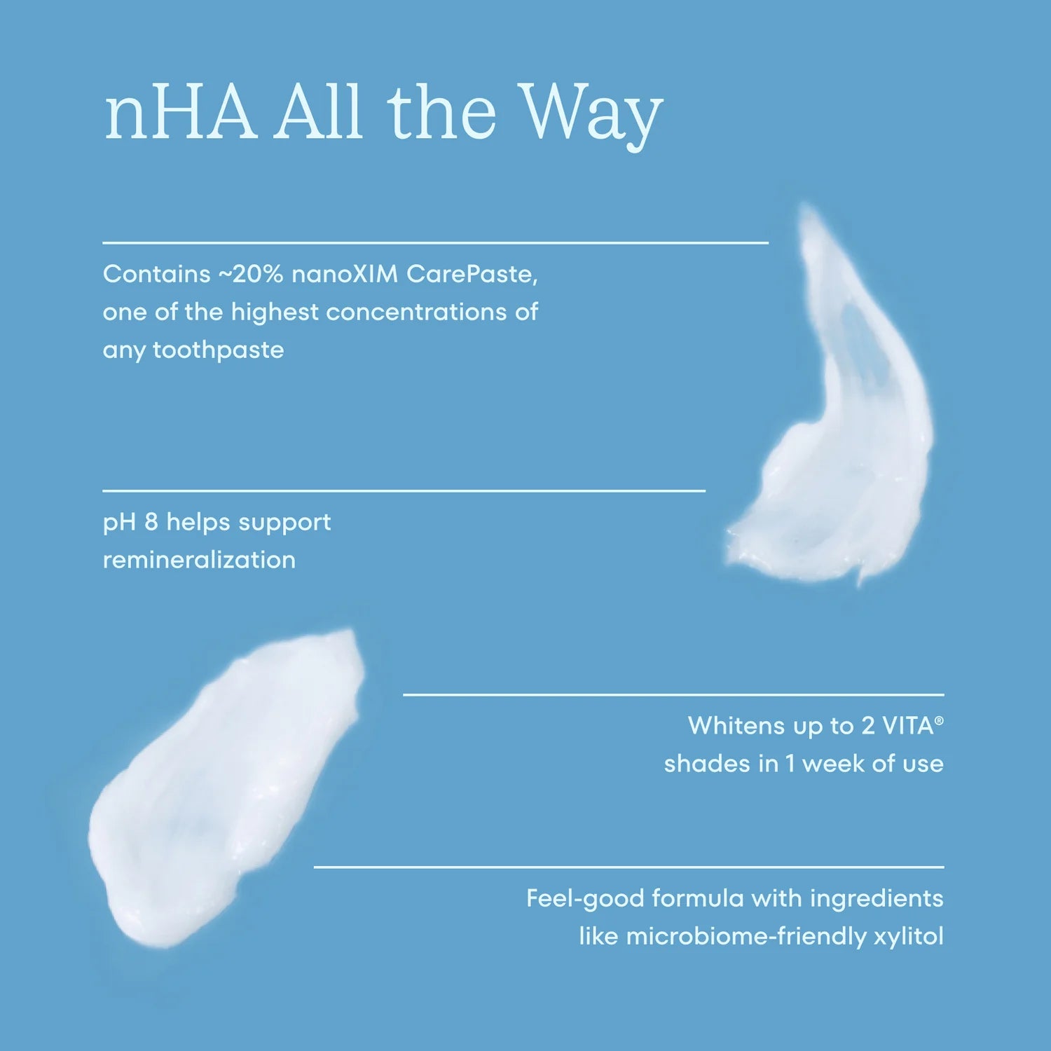 A remineralizing toothpaste that whitens and brightens with a 3% concentration of nano-hydroxyapatite (n-HA) that's 2x more effective. No toxins, abrasives, or symptom-maskers. Formulated with your teeth’s natural minerals, plus baking soda, xylitol, coconut oil, aloe vera, and silica. Whitens 2 shades in 1 week, repairs sensitivity in 2 mins, and rebuilds enamel 2x faster. Fluoride-free and formulated to be swallowed. Ocean-bound plastic in tubes: recycle with Pact when you're done!